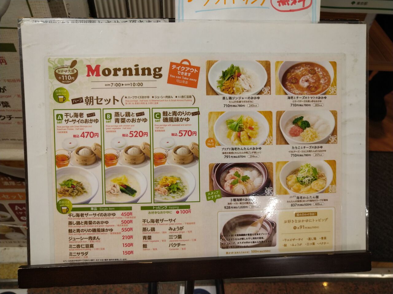 「女性が入りやすい健康的なファストフードを」という想いで、2001年新宿京王モールに1号店をオープン。野菜たっぷりのおかゆ、チーズやトマトを使ったおかゆの他、中華麺、点心などカラダに優しく、見た目も華やかなメニューを多数ご用意しております。